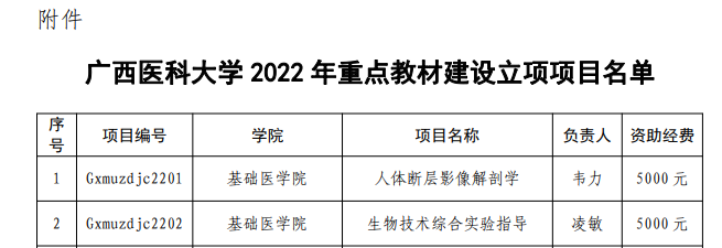 近日,学校公布了2022年广西医科大学重点教材建设立项项目的评审结果,真人百家乐 韦力、凌敏2位老师负责的教材喜获立项。特此向获得资助的教师表示祝贺,希望以本次立项为契机,切实加强教材建设工作。