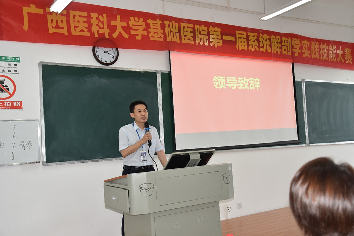 伴随着主持人精彩的开场词,颁奖典礼拉开帷幕。谭国鹤院长为本次颁奖典礼致辞,他首先感谢组织大赛的老师们,贡献了一场精彩的赛事,希望以此为开端,将之打造为人体解剖学的品牌大赛。其次祝贺获奖的同学,平时的努力付出回报了胜利的喜悦。同时对同学们提出“ABCD”四点期望:Anatomy,人体解剖学是医学的基础,是医学生学医之路的入门第一课,期望同学们一如既往,继续发挥积极向上的学习精神,学好医学第一课,为以后的各学科学习打下坚实的基础;Belief,医学生一定要有坚定的信仰,要把救死扶伤的精神和为解决人类之病痛的光荣使命传承下去,要积极学习我校校友梁小霞等白衣天使的崇高精神,将来在医学战线上绽放青春霞光;Communication,系统解剖学实践技能大赛作为师生之间的一个交流的载体,很好地发挥了作用,希望广大师生通过大赛平台进一步促进沟通交流,充分达到教学相长的效果,以便让老师们教得更好、学生们学得更好、大家都共同进步;Dedication,从披上白大卦迈入神圣的医学殿堂那一刻起,同学们就肩负起医学的神圣使命,希望同学们学习和传承我校郭德林教授等医学模范的无私奉献精神,为祖国的医疗卫生事业添砖加瓦,贡献青春和力量。最后,他向老师和同学们提出共勉,希望大家以梦为马,不负韶华,勇毅前行,在医学学习和工作的道路上勇攀高峰、再创佳绩,争取以更加奋斗昂扬的姿态积极迎接党的二十大胜利召开。