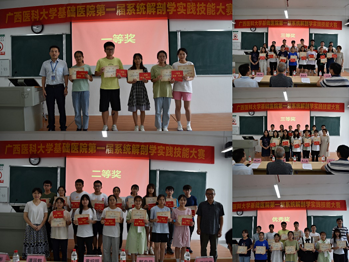 2022年6月11日,由真人百家乐 主办,人体解剖学教研室承办的手机真人百家乐平台 第一届系统解剖学实践技能大赛圆满落下帷幕。经过激烈的角逐,在1260名参赛选手中最终评出一等奖5名、二等奖15名、三等奖30名、优秀奖55名。2022年6月13号下午,学院在武鸣校区A2栋5楼解剖学实验室举行了本次大赛的颁奖典礼,谭国鹤院长、罗彬副院长、教研科科长郭忠信及人体解剖学教研室黄绍明主任、邓琼英副主任、人体解剖学教研室党支部磨洁琳书记、玉洪荣副书记出席此次颁奖典礼。颁奖典礼由磨洁琳书记主持。