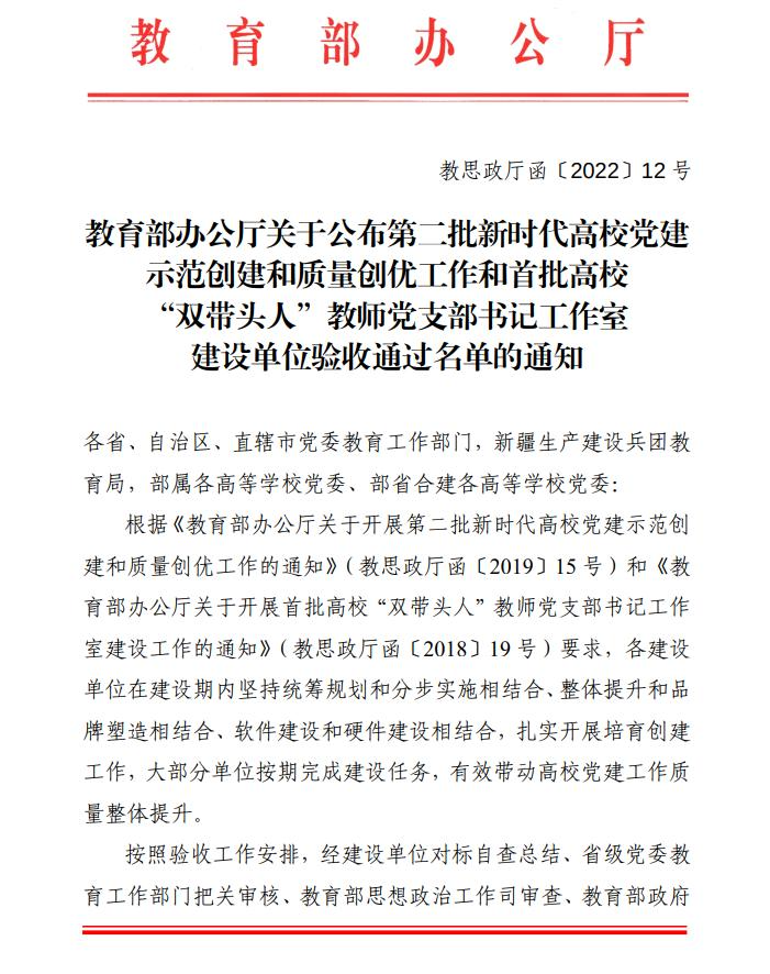 近日,教育部办公厅公布了第二批新时代高校党建示范创建和质量创优工作和首批高校“双带头人”教师党支部书记工作室建设单位验收通过名单,真人百家乐 人体解剖学教研室党支部通过了“全国党建工作样板支部”验收,特此表示热烈祝贺!
