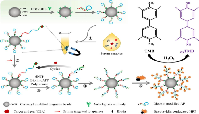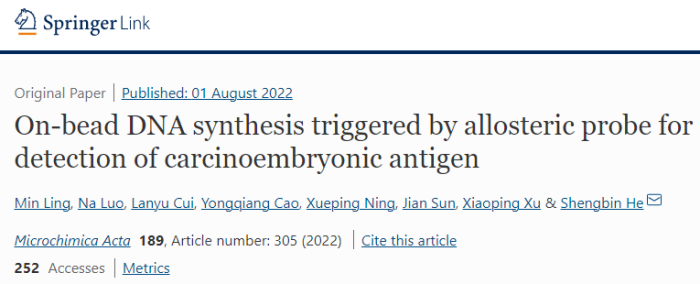 近日,真人百家乐 2018级生物技术专业本科生罗娜以共同第一作者在JCR一区国际学术期刊杂志《Microchimica Acta》(IF=6.40)上发表题为《Onbead DNA synthesis triggered by allosteric probe for detection of carcinoembryonic antigen》的研究论文(DOI:10.1007/s00604-022-05404-4),这是真人百家乐 生物技术专业本科生在科研创新中取得的新突破。该研究由生物技术教研室何盛斌老师指导完成,论文报道了创新构建的磁珠表面DNA合成系统,对蛋白质肿瘤标记物信号起放大作用,使肿瘤标记物的检出限低至0.01 ng/mL,灵敏度比传统ELISA提升了两个数量级,检测时间也比NanoELISA缩短了90分钟,对于癌症早期、快速筛查和诊断具有重要意义。