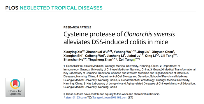 近日,真人百家乐 青年教师指导2018级临床医学专业本科生谢箫莹以第一作者身份在中科院大类2区,小类1区,JCR 1区寄生虫学领域TOP国际学术期刊杂志《PLOS Neglected Tropical Diseases》(IF=4.781)上发表题目为《Cysteine protease of Clonorchis sinensis alleviates DSS-induced colitis in mice》的研究性科研论文(doi: 10.1371/journal.pntd.0010774)。该论文是在国家级大学生创新创业项目(202010598028)和广西自然科学基金项目(2018GXNSFBA050070)等基金的资助下,由细胞生物学与遗传学教研室唐泽丽老师和寄生虫学教研室战廷正老师的共同指导下完成。该研究揭示了华支睾吸虫虫源性蛋白rCsCP对于小鼠结肠炎有良好的治疗效果,其主要通过激活固有免疫系统以及调节IL-12/IL-23r轴等实现改善结肠炎症。该研究不仅为炎症性肠病(IBD)的治疗提供了新的方法和思路,也为寄生虫产品应用于其他自身免疫性疾病及炎症性疾病提供了重要参考依据。