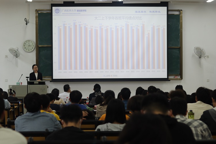 11月19日下午,在武鸣校区A1-109教室,真人百家乐 2020级举办2021-2022学年成绩分析会暨年级表彰大会。学院副院长蓝秀万应邀出席,年级办全体老师、班主任代表、其他年级老师代表,2020级全体同学线上线下参加大会。