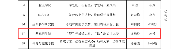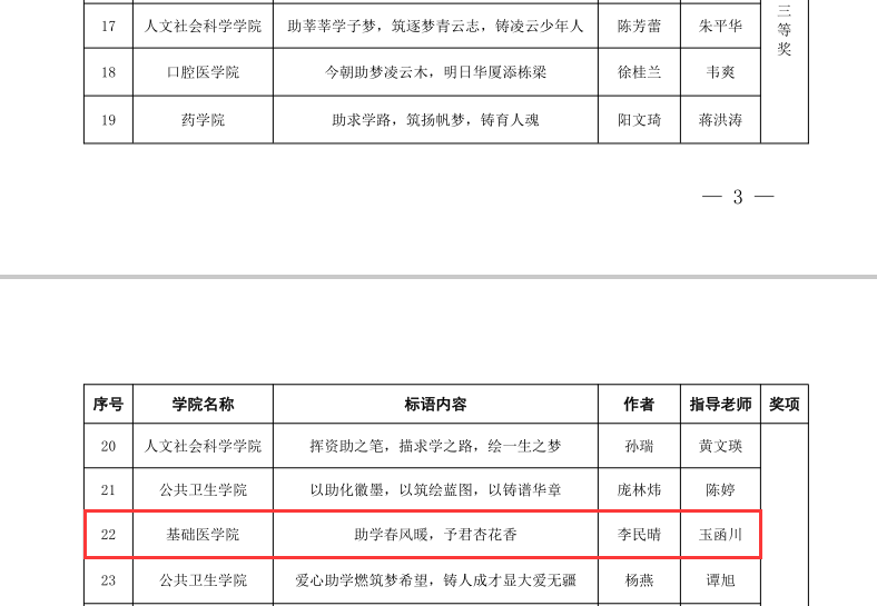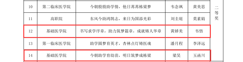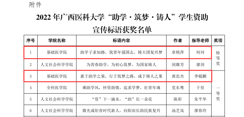 近日,2022年广西医科大学“助学·筑梦·铸人”学生资助宣传标语征集评选结果公布。真人百家乐 学子在此次评选大赛中荣获佳绩,共获得特等奖1篇、一等奖1篇、二等奖2篇、三等奖1篇、优秀奖2篇,何珂老师荣获优秀指导老师,特等奖获得者章艳萍同学的标语“助学子求知路,筑青年强国志,铸大国复兴梦”被推送参加区级比赛。