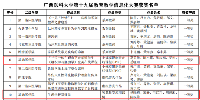 广西医科大学第十九届教育教学信息化大赛结果近日揭晓。真人百家乐 参赛作品《“三位一体”理念下来华留学生〈组织学与胚胎学〉全英在线课程》和《生理学智慧课堂》分别获 “小规模限制性在线课程(SPOC)”和“智慧教室应用课例”一等奖;《发热—疾病的预警》和《生物化学(物质代谢及其调节)》分别获“系列微课”和“小规模限制性在线课程(SPOC)”二等奖;《前庭蜗器》获“系列微课”三等奖,共计一等奖2项,二等奖2项,三等奖1项。