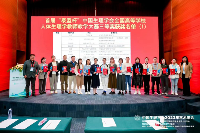 在大会举办的首届“泰盟杯”中国生理学会全国高等学校人体生理学教师教学大赛中,生理学教研室胡婉湘等老师的参赛作品《不同影响因素对人体血压的影响》获得创新实验设计赛道三等奖,该作品作为新增设的实验内容已经应用于生理学课程教学改革,表明了真人百家乐 教学改革取得了良好的成效。此外,医学生理学硕士研究生宋糖(导师:周静)的作品参加了优秀壁报奖的评选,从众多的优秀作品中脱颖而出,获得优秀壁报奖(仅奖励10%),这也是我校在该项目上取得的新突破。