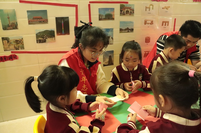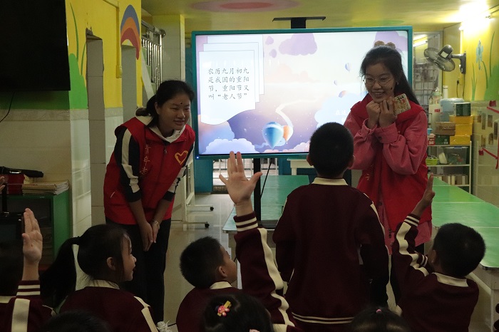 活动中,志愿者以PPT、视频的方式向孩子们科普流鼻血的应急处理方法,并带领他们学习幼儿版“七步洗手操”,从而提高孩子们的健康防护意识。随后,志愿者向孩子们讲述重阳节的风俗习惯,与他们一起朗诵诗歌、开展趣味小游戏,孩子们积极参与,在欢声笑语中让孩子们从小树立起“尊老敬老”的中华传统美德;志愿者们还教授孩子们折纸方法、黏土造型塑造,教室里洋溢着欢乐祥和的气氛。此外,志愿者还结合幼儿园安全保障、幼儿园办学发展现状等话题对燕燕幼儿园园长进行访谈,了解到了目前武鸣区幼儿园的部分建设发展概况以及当前对于基层幼儿园管理要求、发展建设的政策导向,为学院大学生志愿者下一步开展志愿服务活动奠定基础。