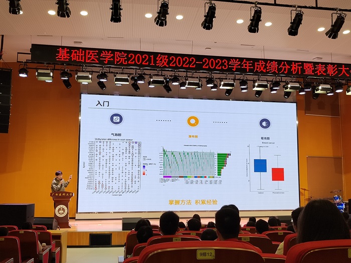 大会伊始,辅导员代表杨彪对2021级2022-2023学年的年级成绩进行深入分析,帮助学生全方位了解过往学习情况,清晰锚定未来学习方向。综合成绩优秀代表周雨虹同学、科研潜力奖获得者陈祖源同学分别从学习和科研方面分享了学习经验;活力班级代表2103班叶欣惠分享了班级管理方法与经验。随后,大会对年级优秀学生进行了现场表彰,2021级年级办主任黄月莹在总结中对获奖个人和集体表示热烈祝贺,并向所有同学致以美好祝福。