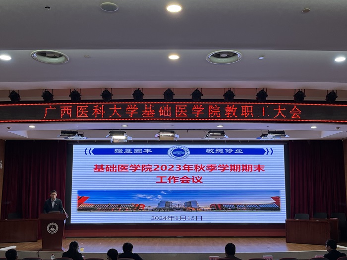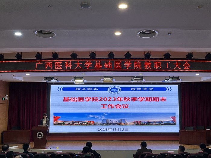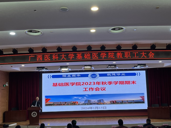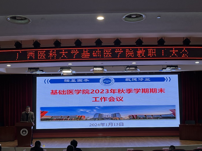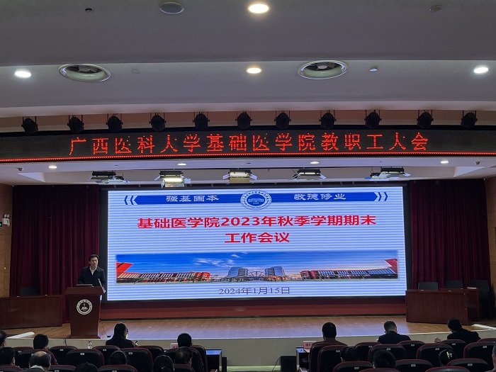 会上,谭国鹤院长从教育教学、科研创新、教师发展、学生工作、平台建设、职工权益保障等方面全面总结了学院2023年秋季学期工作。他指出,一学期来学院全体教职工勠力同心、尽职尽责,保质保量完成了秋季学期各项工作任务,特别是配合学校圆满完成了教育部本科教育教学审核评估,衷心感谢全院教职工的辛勤付出。同时他就寒假及下学期重点工作进行了部署。谭院长强调,2024年是实现“十四五”规划目标任务的关键一年,全体教职工要紧密围绕学校、学院的发展战略要求,积极开拓进取、认真扎实工作,以一往无前的奋斗姿态、永不懈怠的精神状态推进学院工作高质量发展。