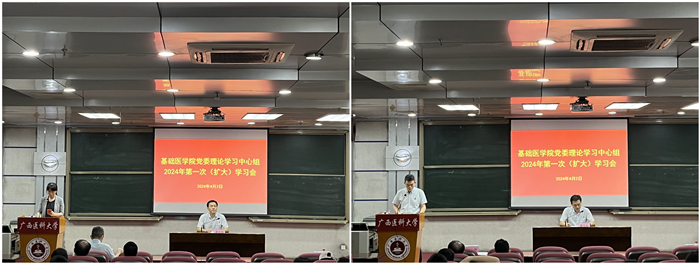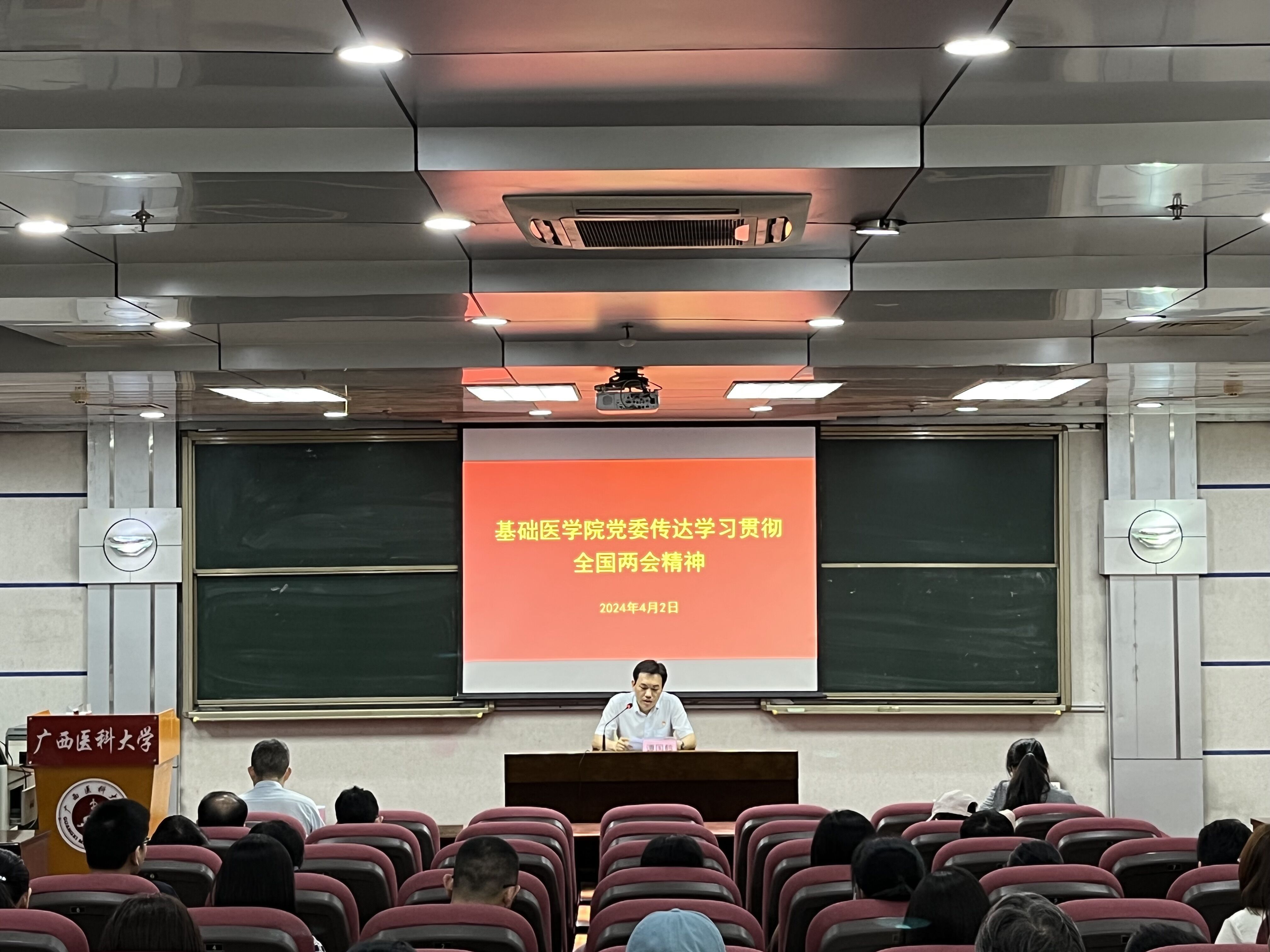 会上,谭国鹤书记传达学习了全国两会精神,重点领学了习近平总书记在参加江苏代表团审议时的重要讲话精神、习近平总书记在看望参加政协会议的民革科技界环境资源界委员时的重要讲话精神、习近平总书记在出席解放军和武警部队代表团全体会议时的重要讲话精神、政府工作报告的主要内容、全国人大常委会和“两高”工作报告的主要内容、关于修改《中华人民共和国国务院组织法》的主要内容。他强调,全院师生要把学习宣传贯彻习近平总书记重要讲话和全国两会精神作为当前重要政治任务,始终坚持以习近平新时代中国特色社会主义思想为指导,全面贯彻党的二十大和二十届二中全会以及全国两会精神,持续深入贯彻落实习近平总书记对广西重大方略要求,切实把思想和行动统一到党中央决策部署、全国两会精神和自治区工作安排上来,凝心聚力、真抓实干,以优异成绩迎接新中国成立75周年,积极为校庆90周年献礼,为推动边疆民族地区基础医学高质量发展贡献力量。此外,作为十四届全国人大代表,谭国鹤还从大会盛况、广西代表团履职情况、个人履职体会等方面,与师生进行了分享交流。