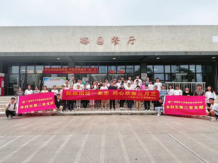 4月初,学院推出“‘三月三’聚民族情,团结奋进铸同心”系列创意短视频,来自广西十二个世居民族的医大学子汇聚医大,携手成长,共庆“三月三”。系列短视频发布在“微信视频号”、“抖音”、“QQ短视频”等多个短视频互动平台,四天内获得5W浏览量。11日,学院联合武鸣校区校园食堂,开展“民族团结一家亲 同心欢度三月三”团建活动,学院党委副书记李文奇与辅导员教师代表们与学生欢聚一堂,一起包饺子、抢答民俗知识、分享民族特色文化。