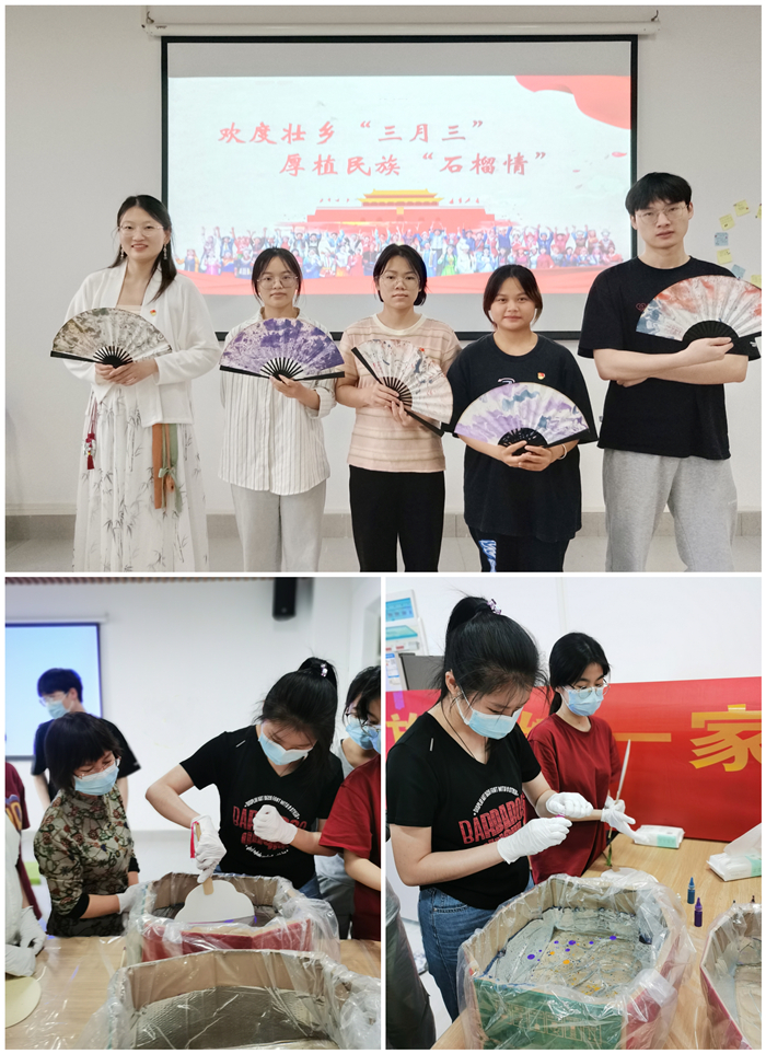 12日,学院在明德楼开展“欢度壮乡‘三月三’厚植民族‘石榴情’”非遗文化创意手工艺品体验活动,共同体验非遗艺术——漂漆扇和印章篆刻艺术。同学们创意创新,亲手制作出一扇扇各具特色的漂漆扇艺术作品,在亲身实践中感受中华优秀传统文化的魅力,“沉浸式”感受传统非遗文化工艺与现代创意的完美结合。