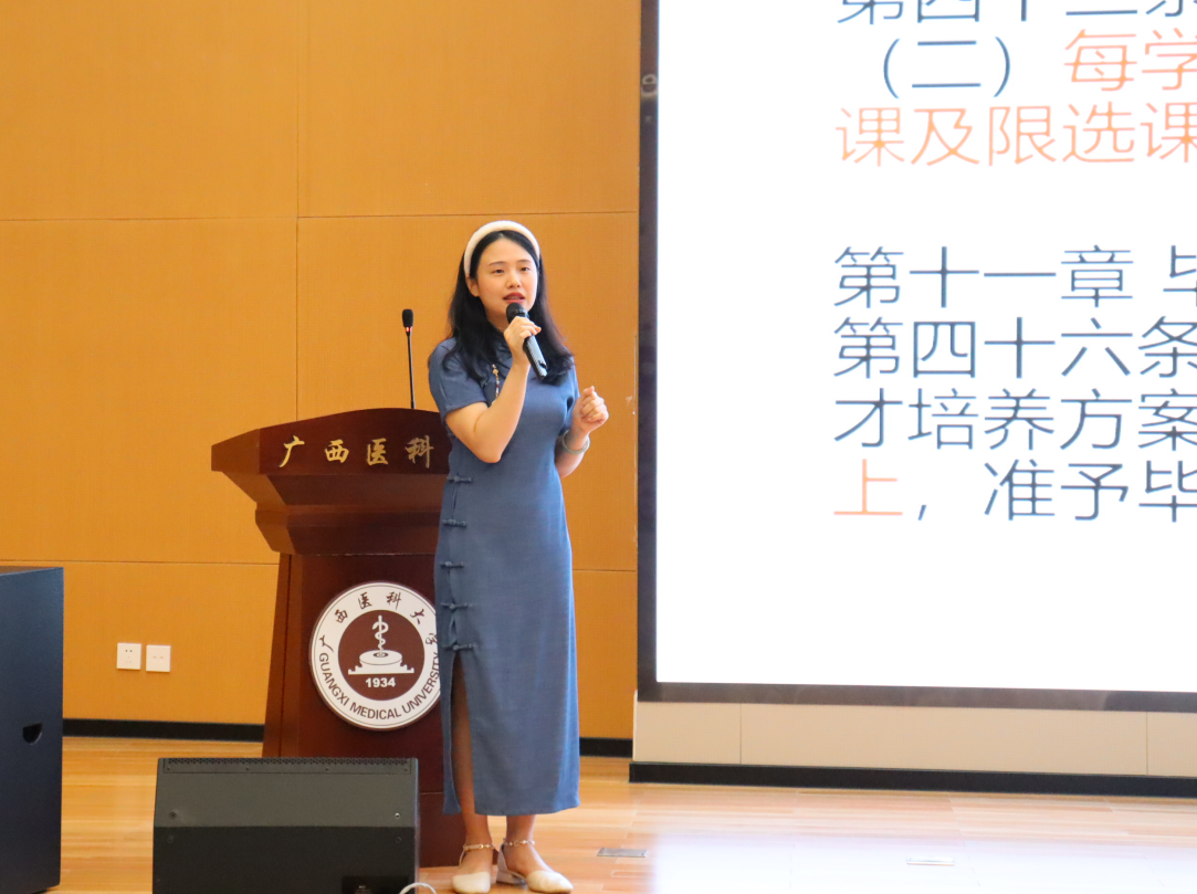 首先,辅导员谭璟婧对2022级前三个学期的成绩进行全面、深刻的分析与总结,帮助学生更好地找准定位,锚定今后努力的方向。随后,辅导员农燕宣读表彰文件及获奖名单,鼓励同学们见贤思齐,挺膺担当,做奋进有为的新时代青年。接着,第二班主任为年级优秀学生颁奖,在经验分享环节,科研潜力奖获得者鲁牧原、医大好同窗获奖者郑深穗、活力班级奖获得者代表蓝一凡等同学分别从自身科研规划、研学感悟、班级文化建设等方面进行了分享。最后,2022级年级办主任蒋忆武对本次会议进行总结,勉励广大学子牢记医者初心,勇担健康使命,励志勤学,强基固本,将个人理想的实现融入建设健康中国的实践中。
